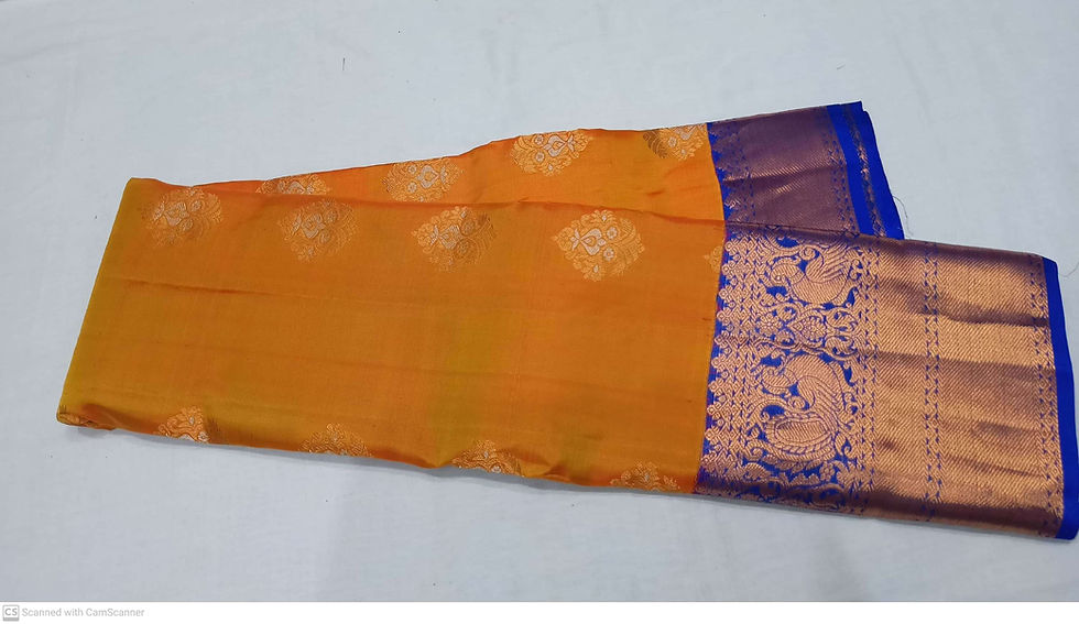 Golden mustard with peacock blue colour kanchipuram pure silk saree